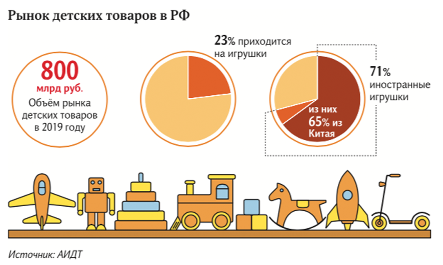 Объем рынка детских товаров в России оценивается в 800 млрд рублей, свидетельствуют данные АИДТ за 2019 год. 23% приходится на игрушки. Из них 71% — импортные. 65% игрушек зарубежного производства приходят из Китая.